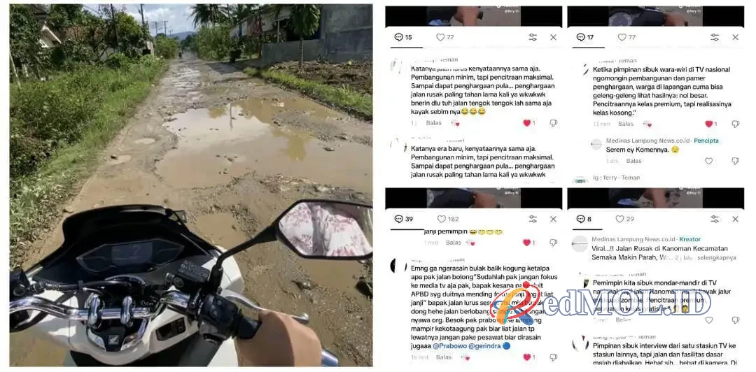 Tanggamus, RedMOL.id - Kondisi jalan di Pekon Kanoman, Kecamatan Semaka, Kabupaten Tanggamus, kembali mencuri perhatian publik. Jalur utama antarpekon yang sejak lama rusak parah kini berubah menjadi kubangan lumpur, menyulitkan akses warga dan mengancam keselamatan pengendara. Situasi yang telah berlangsung bertahun-tahun tanpa perbaikan berarti ini memicu ledakan kritik setelah akun TikTok Medinas Lampung News mengunggah video kondisi jalan tersebut pada 27 November 2025.